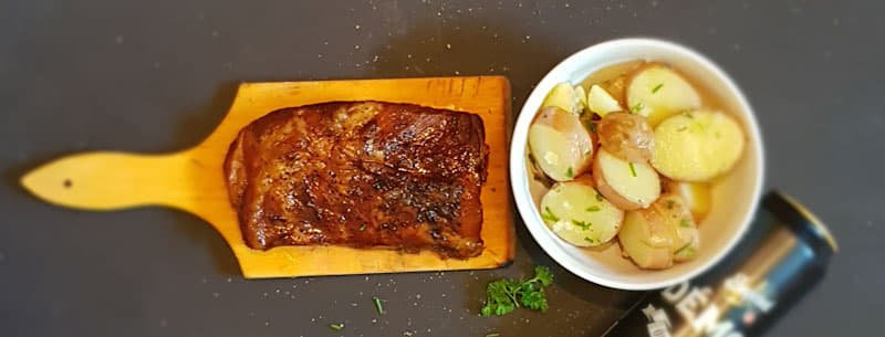 Ma egy olyan démoni verzióban sütöttem, amihez kell némi barna sör. A barna sörben az alkohol és a karamellmaláta gondoskodik arról, hogy a húsunk még puhább legyen. És tényleg semmi faxni, csak só, bors, másfél kiló oldalashoz kb 3 deci barna sör, egy pici zsír, vagy olaj. Egy tepsiben, 120 fokon, kb 3 órát lefedve, majd egy órát fólia/fedő nélkül, néha a szaftjával meglocsolva kész is a démoni oldalas.